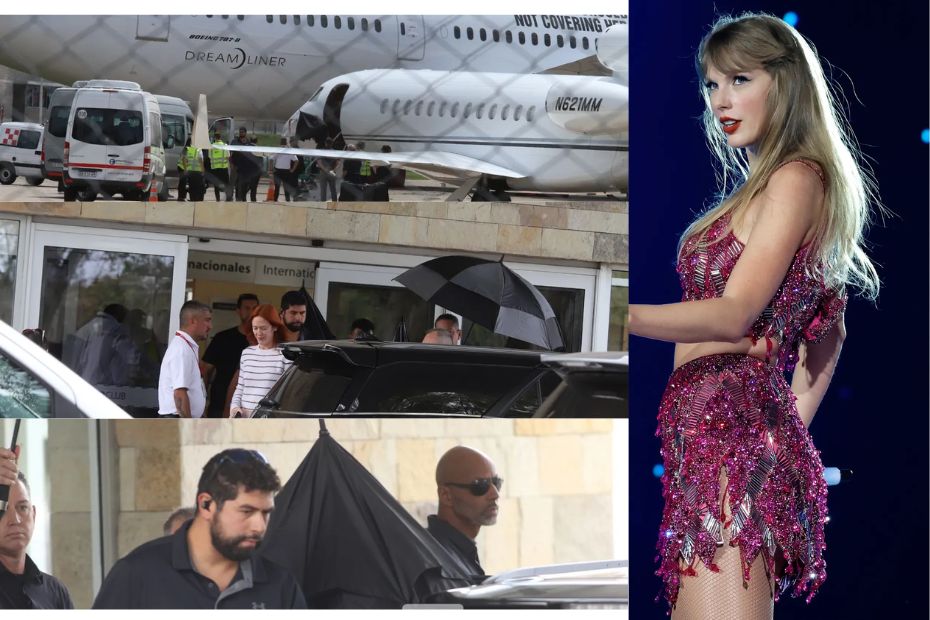 El artista descendió del avión privado en el que viajaba y quedó cubierto por un paraguas negro gigante para evitar que los medios vieran la primera fotografía de Taylor.